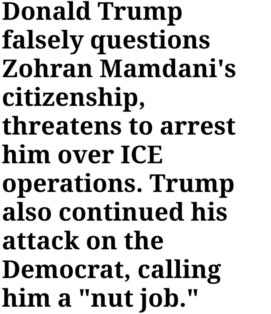 “Threat! The President of the United States just threatened to have me arrested, stripped of my citizenship, put in a detention camp and deported. Not because I have broken any law but because I will refuse to let ICE terrorize our city. His statements don’t just represent an attack on our democracy, but an attempt to send a message to every New Yorker who refuses to hide in the shadows: if you speak up, they will come for you.”